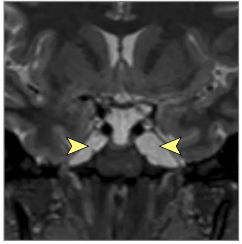| ჰიპერტენზიული ენცეფალოპათია / PRES | მწვავედ დაწყებული ნევროლოგიური სიმპტომები (თავის ტკივილი, დაბნეულობა, ვიზუალური ცვლილებები, კრუნჩხვები) მკვეთრად მომატებული არტერიული წნევის ფონზე. პაპილედემა ხშირია. | მკვეთრად მომატებული არტერიული წნევა გასინჯვისას. თავის ტვინის მრტ აჩვენებს დამახასიათებელ უკანა თეთრი ნივთიერების ვაზოგენურ შეშუპებას (T2/FLAIR ჰიპერინტენსივობა) - PRES პატერნი. სიმპტომები/ვიზუალიზაცია ტიპიურად უკუქცევადია არტერიული წნევის კონტროლირებადი დაწევით. |
