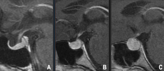 | ჰიპოფიზიტი (ლიმფოციტური, გრანულომატოზური, IgG4) | ჰიპოფიზის/ღეროს ანთება. თავის ტკივილი, მხედველობის დარღვევა, ჰიპოპიტუიტარიზმი (ხშირად სწრაფი დაწყება, მრავალი ღერძი), უშაქრო დიაბეტი (DI) ხშირია (განსაკუთრებით ღეროს ჩართულობა). ლიმფოციტური ხშირად მშობიარობის შემდგომ/აუტოიმუნურ კონტექსტში. | ხშირად სიმეტრიული ჯირკვლის/ღეროს გადიდება და გასქელება, დიფუზური ინტენსიური კონტრასტირება. შეიძლება მიბაძოს ადენომას, მაგრამ ხშირად ღეროს უფრო ინფილტრაციული იერი აქვს. კლინიკური კონტექსტი გადამწყვეტია (სწრაფი დაწყების ჰიპოპიტუიტარიზმი/DI). |