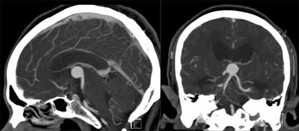 | ძირითადი არტერიის (a. basilaris) წვერის ანევრიზმა | დიდი ანევრიზმა ძირითადი არტერიის ზედა ნაწილში შეიძლება ამოიბურცოს ზემოთ ინტერპედუნკულარულ ცისტერნაში/მე-3 პარკუჭის ფსკერზე. სუბარაქნოიდული სისხლჩაქცევის (SAH) რისკი. | მრტ-მ შეიძლება აჩვენოს ნაკადის სიცარიელე, კომპლექსური სიგნალი თრომბით. MRA/CTA/DSA ადასტურებს სისხლძარღვოვან ბუნებას და განსაზღვრავს ანევრიზმის ანატომიას. |