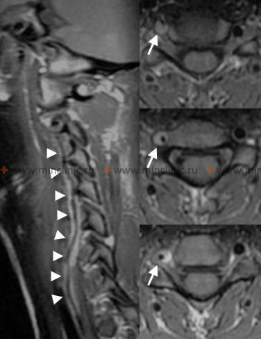| ლატერალური მედულარული სინდრომი (იშემიური ინსულტი) | კლასიკური კონსტელაცია: ვერტიგო, ნისტაგმი, იპსილატერალური ატაქსია, დისფაგია/ხმის ჩახლეჩა, იპსილატერალური სახის და კონტრალატერალური სხეულის ტკივილის/ტემპერატურის დაკარგვა, ჰორნერის სინდრომი. უეცარი დასაწყისი. | მრტ (DWI) ადასტურებს მწვავე ინფარქტს ლატერალურ მოგრძო ტვინში +/- ქვედა ნათხემში. სისხლძარღვოვანი ვიზუალიზაცია (კტა/მრა/დსა) ავლენს ხერხემლის არტერიის/PICA-ს ოკლუზიას/სტენოზს/დისექციას. |