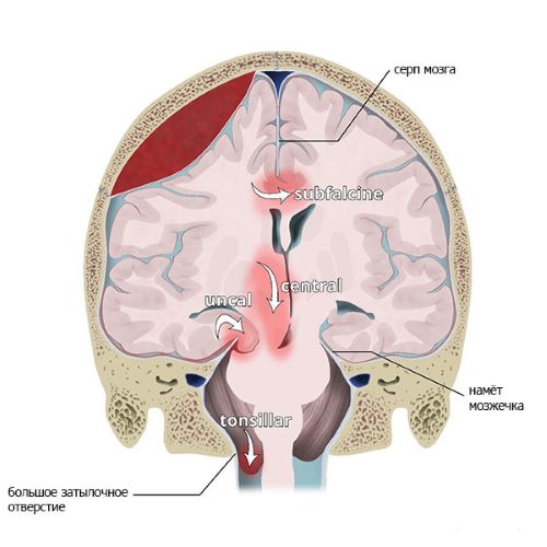 | Синдром вклинения головного мозга (ствола, полушарий или мозжечка): - в отверстие мозжечкового намёта (центральное нисходящее или восходящее вклинение мозжечка), - в большое затылочное отверстие (трансфораминальное вклинение миндалин мозжечка), вклинения под серповидный отросток (вклинение поясной извилины). |