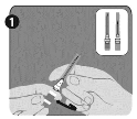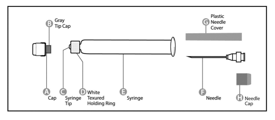 Step 2: With one hand, firmly hold syringe (E) by white textured holding ring (D). With your other hand, insert needle (F) and twist clockwise until it locks into place. Once needle is locked, remove its plastic cover (G).