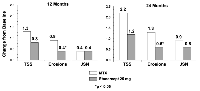 In part 1 of the study, 51 of 69 (74%) patients demonstrated a clinical response and entered part 2. In part 2, 6 of 25 (24%) patients remaining on etanercept experienced a disease flare compared to 20 of 26 (77%) patients receiving placebo (p = 0.007). From the start of part 2, the median time to flare was 116 days for patients who received etanercept and 28 days for patients who received placebo. Of patients who demonstrated a clinical response at 90 days and entered part 2 of the study, some of the patients remaining on etanercept continued to improve from month 3 through month 7, while those who received placebo did not improve.