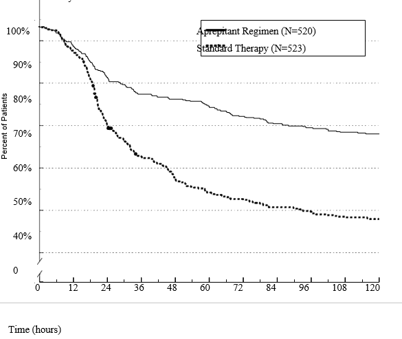 The estimated time to first vomiting after initiation of chemotherapy treatment was longer with the aprepitant regimen (estimated median time to first vomiting was 94.5 hours) compared with the control regimen group (estimated median time to first vomiting was 26.0 hours) as depicted in the Kaplan-Meier curves in Figure 2.