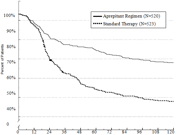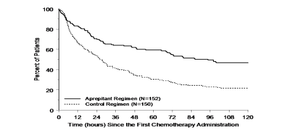 The estimated time to first vomiting after initiation of chemotherapy treatment was longer with the aprepitant regimen (estimated median time to first vomiting was 94.5 hours) compared with the control regimen group (estimated median time to first vomiting was 26.0 hours) as depicted in the Kaplan-Meier curves in Figure 2.