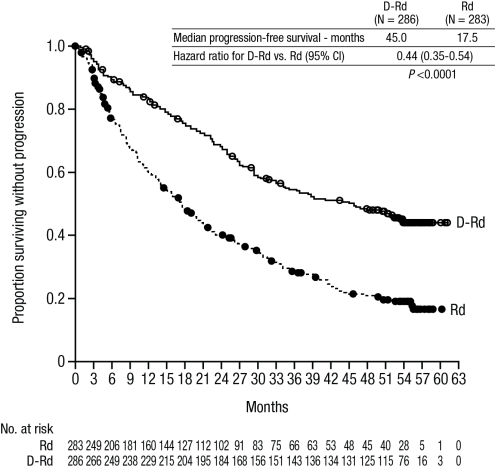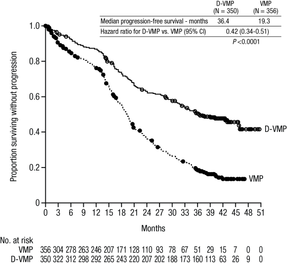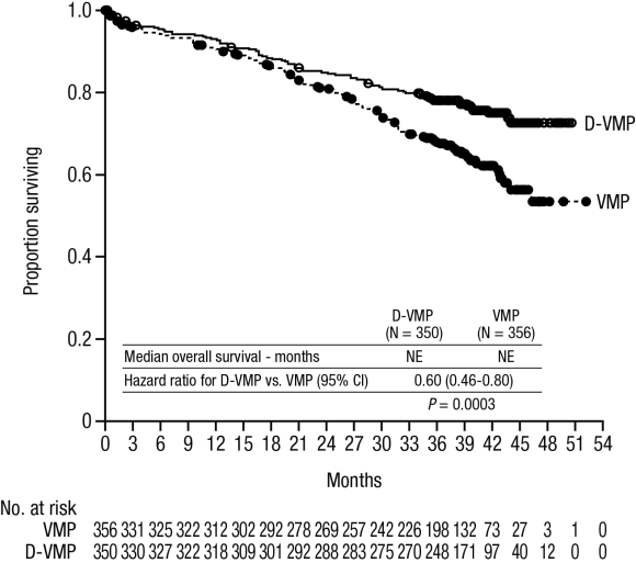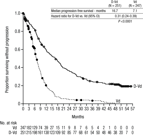 DVd=daratumumab- bortezomib-dexamethasone; Vd=bortezomib-dexamethasone; MRD=minimal residual disease; CI=confidence interval; NE=not estimable.
