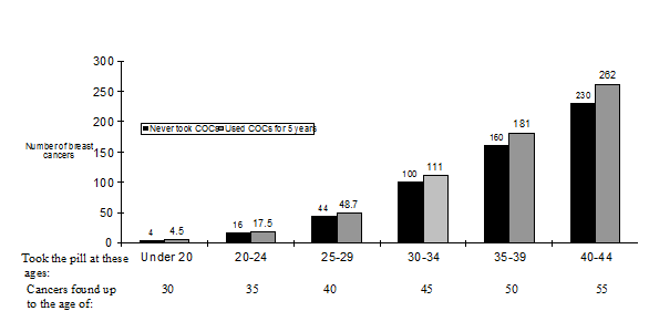 Estimated cumulative numbers of breast cancers per 10,000 women diagnosed in 5 years of use and up to 10 years after stopping COCs, compared with numbers of breast cancers diagnosed in 10,000 women who had never used COCs.