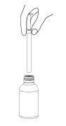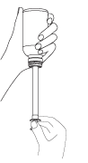 The adaptor is inserted in the bottle before use. The pipette is then put in the adaptor in the upright position and then turned upside down together with the bottle (Fig. 1). In this position the medicine is dosed. At the start of the measuring procedure, the transparent dosing body as well as the white plunger must be in the bottommost position. To measure the dosing quantity, use one hand to hold the bottom, transparent dosing body and the other hand to pull on the top, white plunger until you can read the desired quantity in ml.