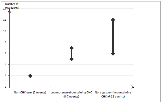 It is estimated that out of 10,000 women who use a low dose CHC that contains levonorgestrel, about 61 will develop a VTE in one year. Studies have suggested that the incidence of VTE in women who used EVRA is up to 2-fold higher than in users of CHCs that contain levonorgestrel. This corresponds to between about 6 and 12 VTEs in a year out of 10,000 women who use EVRA.