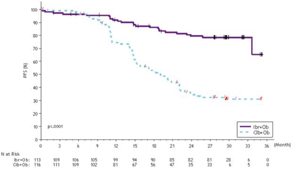 With a median follow-up time on study of 65 months in Study PCYC-1112-CA, an 85% reduction in the risk of death or progression by investigator assessment was observed for patients in the IMBRUVICA arm. The median investigator-assessed PFS according to IWCLL criteria was 44.1 months [95% CI (38.47, 56.18)] in the IMBRUVICA arm and 8.1 months [95% CI (7.79, 8.25)] in the ofatumumab arm, respectively; HR=0.15 [95% CI (0.11, 0.20)]. The updated Kaplan-Meier curve for PFS is shown in Figure 9. The investigator-assessed ORR in the IMBRUVICA arm was 87.7% versus 22.4% in the ofatumumab arm. At the time of final analysis, 133 (67.9%) of the 196 subjects originally randomised to the ofatumumab treatment arm had crossed over to ibrutinib treatment. The median investigator-assessed PFS2 (time from randomisation until PFS event after first subsequent anti-neoplastic therapy) according to IWCLL criteria was 65.4 months [95% CI (51.61, not estimable)] in the IMBRUVICA arm and 38.5 months [95% CI (19.98, 47.24)] in the ofatumumab arm, respectively; HR=0.54 [95% CI (0.41, 0.71)]. The median OS was 67.7 months [95% CI (61.0, not estimable)] in the IMBRUVICA arm.