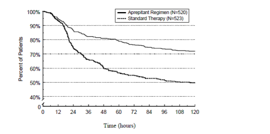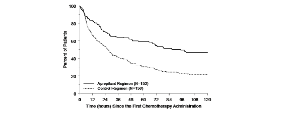 The estimated time to first vomiting after initiation of chemotherapy treatment was longer with the aprepitant regimen (estimated median time to first vomiting was 94.5 hours) compared with the control regimen group (estimated median time to first vomiting was 26.0 hours) as depicted in the Kaplan-Meier curves in Figure 2.