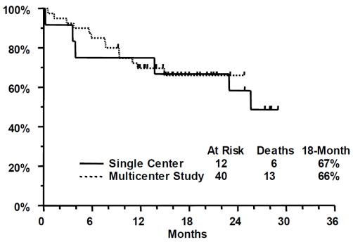 In a follow-up treatment after consolidation, 7 patients in the single institution study and 18 patients in the multicentre study received further maintenance therapy with arsenic trioxide. Three patients from the single institution study and 15 patients from the multicentre study had stem cell transplants after completing arsenic trioxide. The Kaplan-Meier median CR duration for the single institution study is 14 months and has not been reached for the multicentre study. At last follow-up, 6 of 12 patients in the single institution study were alive with a median follow-up time of 28 months (range 25 to 29). In the multicentre study 27 of 40 patients were alive with a median follow-up time of 16 months (range 9 to 25). Kaplan-Meier estimates of 18-month survival for each study are shown below.