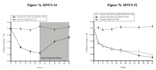 Dupilumab is intended for long-term treatment. Consideration should be given to discontinuing treatment in patients who have shown no response after 24 weeks of treatment for CRSwNP. Some patients with initial partial response may subsequently improve with continued treatment beyond 24 weeks.