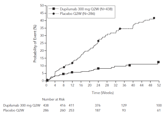 • For patients with severe asthma and who are on oral corticosteroids or for patients with severe asthma and co-morbid moderate-to-severe atopic dermatitis or adults with co-morbid severe chronic rhinosinusitis with nasal polyposis, an initial dose of 600 mg (two 300 mg injections), followed by 300 mg every other week administered as subcutaneous injection.