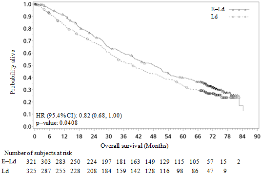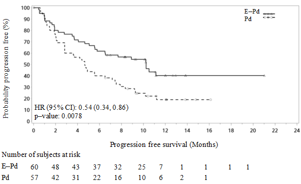 Overall survival (OS) was a key secondary study endpoint. The OS data from the exploratory analysis were not mature at the data cut-off (29 November 2018) with a minimum follow up of 18.3 months. A total of 40 (67%) patients were alive in the E-Pd arm and 29 (51%) in the Pd arm. Median OS was not reached for E-Pd treatment group. The hazard ratio and 95% CI were 0.54 (0.30, 0.96).