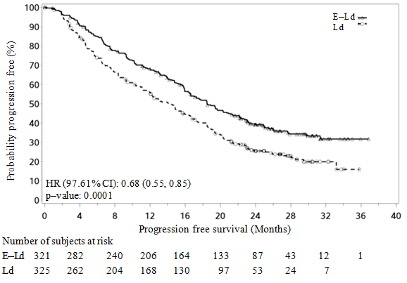 PFS ITT assessment per investigator was evaluated in several subgroups including age (< 65 versus ≥ 65), race, ISS stage, prior therapies, transplant, risk category, ECOG status, creatinine clearance, and cytogenic abnormalities. Regardless of the subgroup evaluated, PFS was generally consistent with that observed in the ITT population for the treatment groups. However, results should be taken with caution as assessment of consistency of effect within the different subgroups was hampered by the very limited number of patients included in the different subgroups.