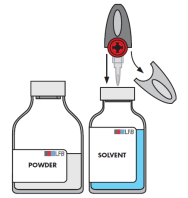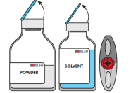 Remove the protective cap from the solvent vial and from the powder vial.