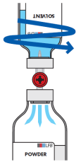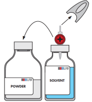 During transfer, direct the jet of solvent over the entire surface of the powder and along the wall of the vial by a rotational horizontal movement. Ensure that all of the solvent is transferred.