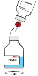 Turn the solvent vial and quickly push the free end of the piercing spike into the center of the stopper of the powder vial to allow the solvent to transfer into the powder.