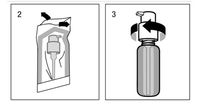 The dosing pump has to be removed from the plastic bag (fig. 2) and placed on top of the bottle, sliding the plastic dip tube carefully into the bottle. Then the dosing pump needs to be held onto the neck of the bottle and screwed clockwise until it firmly attached (fig. 3). For the intended use the dosing pump is only screwed on once when starting the use, and should never be unscrewed.