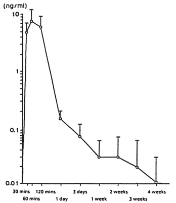 Figure 1 presents leuprorelin serum levels after a single s.c. administration of leuprorelin acetate depot at a dosage of 30 µg/kg body weight. Peak serum levels are reached sixty minutes after administration (7.81 ± 3.59 ng/m)l. The AUC0-672 is 105.78 ± 52.40 ng x hr/ml.