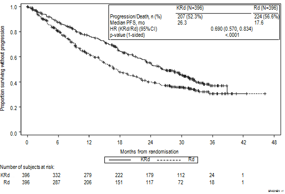 In patients who received prior lenalidomide (38%), median PFS was 12.9 months in the Kd arm versus 7.3 months in the Vd arm (HR = 0.69, 95% CI: 0.52, 0.92), ORR was 70.1% versus 59.3%. In patients refractory to lenalidomide (25%), median PFS was 8.6 months in the Kd arm versus 6.6 months in the Vd arm (HR = 0.80, 95% CI: 0.57, 1.11), ORR was 61.9% versus 54.9%.