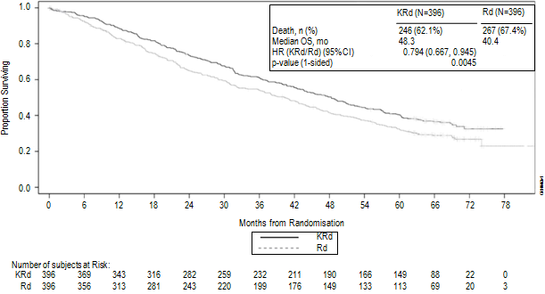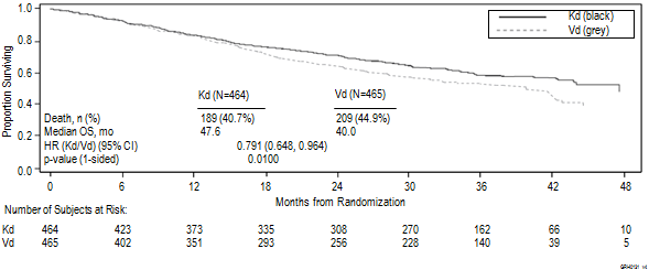 A pre-planned second interim OS analysis was performed after 189 deaths in the Kd arm and 209 deaths in the Vd arm. At the time of the analysis, 80% of the targeted events were registered. The median follow-up was approximately 37 months. A statistically significant advantage in OS was observed in patients in the Kd arm compared to patients in the Vd arm (HR = 0.791; 95% CI: 0.65, 0.96; p-value = 0.010) (see figure 4).