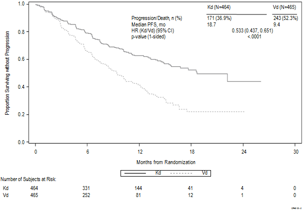 The study showed significant improvement in PFS for patients in the Kd arm over those in the Vd arm (HR: 0.53, 95% CI: 0.44, 0.65 [p-value < 0.0001]) (see figure 3).