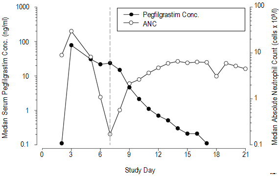 Figure 1. Profile of median pegfilgrastim serum concentration and Absolute Neutrophil Count (ANC) in chemotherapy treated patients after a single 6 mg injection