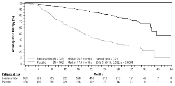Enzalutamide demonstrated a statistically significant delay in the time to first use of new antineoplastic therapy compared to placebo [HR = 0.21 (95% CI: 0.17, 0.26), p < 0.0001]. Median time to first use of new antineoplastic therapy was 39.6 months (95% CI: 37.7, NR) on the enzalutamide arm versus 17.7 months (95% CI: 16.2, 19.7) on the placebo arm.