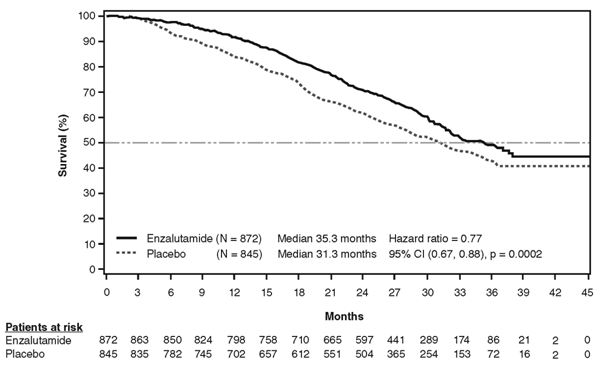 At the pre-specified interim analysis for overall survival when 540 deaths were observed, treatment with enzalutamide demonstrated a statistically significant improvement in overall survival compared to treatment with placebo with a 29.4% reduction in risk of death [HR = 0.706 (95% CI: 0.60; 0.84), p < 0.0001]. An updated survival analysis was conducted when 784 deaths were observed. Results from this analysis were consistent with those from the interim analysis (Table 3, Figure 4). At the updated analysis 52% of enzalutamide-treated and 81% of placebo-treated patients had received subsequent therapies for metastatic CRPC that may prolong overall survival.