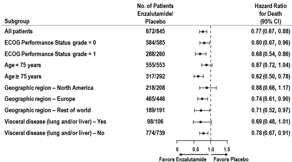 The demographic and baseline characteristics were well-balanced between the two treatment arms. The median age at randomisation was 74 years in the enzalutamide arm and 73 years in the placebo arm. Most patients (approximately 71%) in the study were Caucasian; 16% were Asian and 2% were Black. Eighty-one percent (81%) of patients had an ECOG performance status score of 0 and 19% patients had an ECOG performance status of 1.