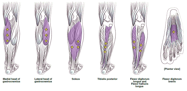 The following diagrams indicate the injection sites for adult lower limb spasticity: