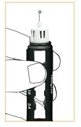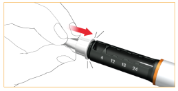Any remaining air in the cartridge should be removed before use. Dial the test dose forward by turning the dosage wheel. Check the dialed dose by looking vertically from above and not at an angle onto the display, so that the symbol ““ is clearly displayed. This is called “priming” and is important because it ensures you get a full dose when you use the pen.