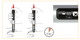Press the push-button in fully for injection. Hold the push-button fully down during medication discharge. After the medication has been completely discharged, wait for 6 seconds and then pull out the pen needle slowly. You may either keep the push-button pressed or release it during the 6 seconds. Check that the display is at the “0,0” position to confirm full dose delivery.