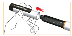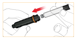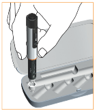 Place the outer pen needle shield in the appropriate left notch of your carrying case. The opening of the needle shield should be pointing up. Carefully insert the needle (attached to the pen) into the opening of the shield. Without holding onto the shield, push down firmly and turn counter-clockwise to twist off the pen needle.