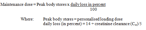 The maintenance dosage should be based upon the percentage of the peak body stores lost each day through elimination. The following formula has had wide clinical use: