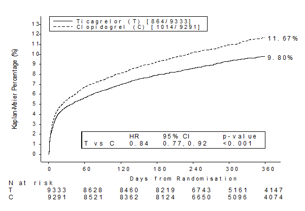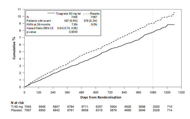 Both 60 mg twice daily and 90 mg twice daily regimens of ticagrelor in combination with ASA were superior to ASA alone in the prevention of atherothrombotic events (composite endpoint: CV death, MI and stroke), with a consistent treatment effect over the entire study period, yielding a 16% RRR and 1.27% ARR for ticagrelor 60 mg and a 15% RRR and 1.19% ARR for ticagrelor 90 mg.