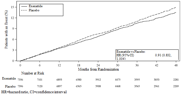 Prolonged-release exenatide did not increase the cardiovascular risk in patients with type 2 diabetes mellitus compared to placebo when added to current usual care (HR:0.91; 95% CI: 0.832, 1.004; P < 0.001 for non-inferiority) see Figure 1. In a pre-specified subgroup analysis in EXSCEL, the HR for MACE was 0.86 (95% CI: 0.77-0.97) in patients with baseline eGFR ≥ 60 mL/min/1.73 m2 and 1.01 (95% CI: 0.86-1.19) in patients with baseline eGFR < 60 mL/min/1.73 m2. The results of the primary composite and secondary cardiovascular endpoints are shown in Figure 2.