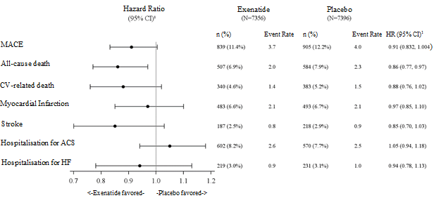 The primary safety (noninferiority) and efficacy (superiority) endpoint in EXSCEL was the time to first confirmed Major Adverse Cardiac Event (MACE): cardiovascular (CV)-related death, nonfatal myocardial infarction (MI) or nonfatal stroke. All-cause mortality was the initial secondary endpoint assessed.