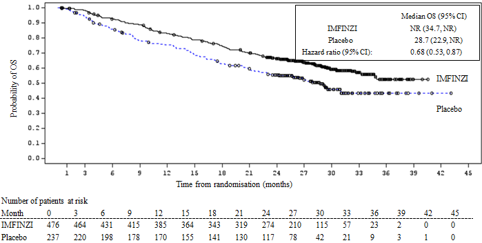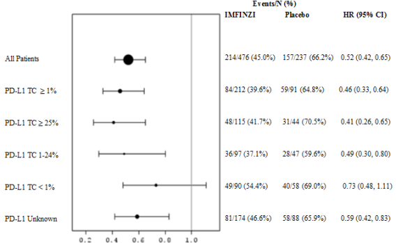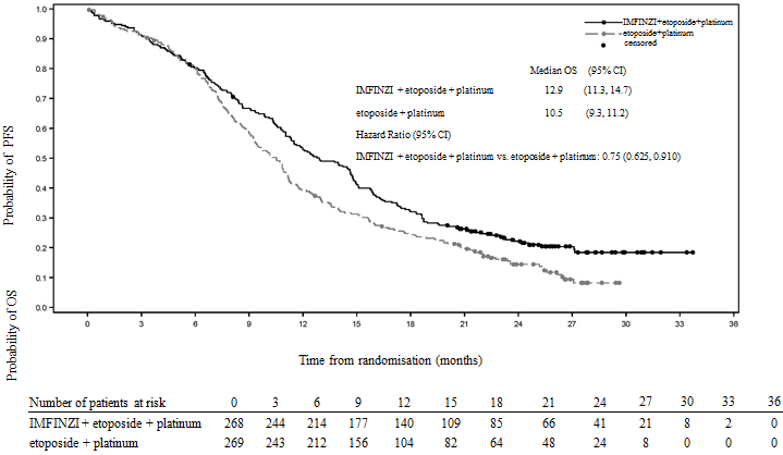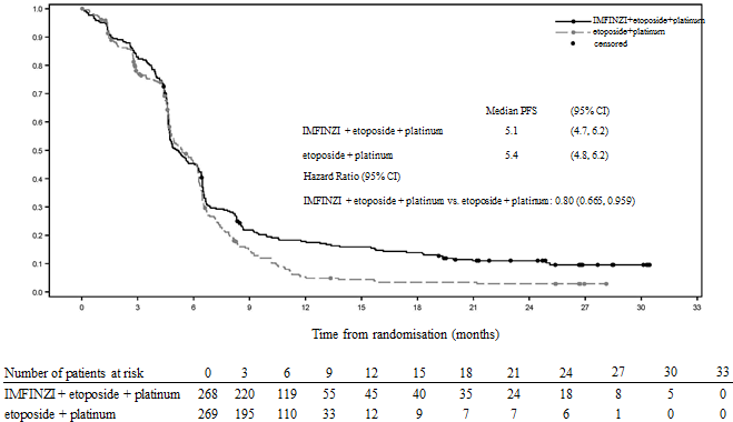 The improvements in OS in favour of patients receiving IMFINZI + etoposide + platinum compared to those receiving etoposide + platinum alone, were consistently observed across the prespecified subgroups based on demographics, geographical region, carboplatin or cisplatin use and disease characteristics.
