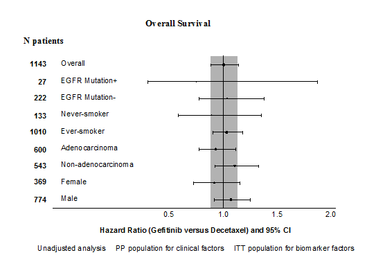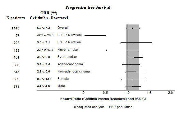 The IFUM study was a single-arm, multicentre study conducted in Caucasian patients (n=106) with activating, sensitising EGFR mutation positive NSCLC to confirm that the activity of gefitinib is similar in Caucasian and Asian populations. The ORR according to investigator review was 70% and the median PFS was 9.7 months. These data are similar to those reported in the IPASS study.