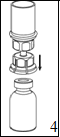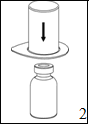 4. Place the product vial on an even and firm surface. Invert the solvent vial with the Mix2Vial set attached and push the spike of the transparent adapter end straight down through the product vial stopper. The solvent will automatically flow into the product vial.