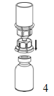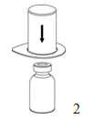 4. Place the product vial on an even and firm surface. Invert the solvent vial with the Mix2Vial set attached and push the spike of the transparent adapter end straight down through the product vial stopper. The solvent will automatically flow into the product vial.