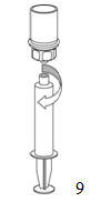 9. Now that the solution has been transferred into the syringe, firmly hold on to the barrel of the syringe (keeping the syringe plunger facing down) and disconnect the transparent Mix2Vial adapter from the syringe.