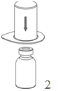 4. Place the product vial on an even and firm surface. Invert the solvent vial with the Mix2Vial set attached and push the spike of the transparent adapter end straight down through the product vial stopper.