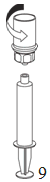 9. Now that the solution has been transferred into the syringe, firmly hold on to the barrel of the syringe (keeping the syringe plunger facing down) and disconnect the transparent Mix2Vial adapter from the syringe by unscrewing counterclockwise.