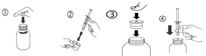 b) Separate the adaptor from the syringe (figure 2). Insert the adaptor into the bottle neck (figure 3). Ensure it is properly fixed. Take the syringe and put it in the adaptor opening (figure 4).
