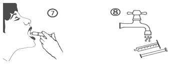 e) Empty the contents of the syringe into the patient's mouth by pushing the piston to the bottom of the syringe (figure 7). Close the bottle with the plastic screw cap. Wash the syringe with water (figure 8).