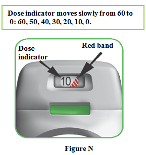 • When a red band appears in the dose indicator, this means you are nearing your last dose (Figure N), or